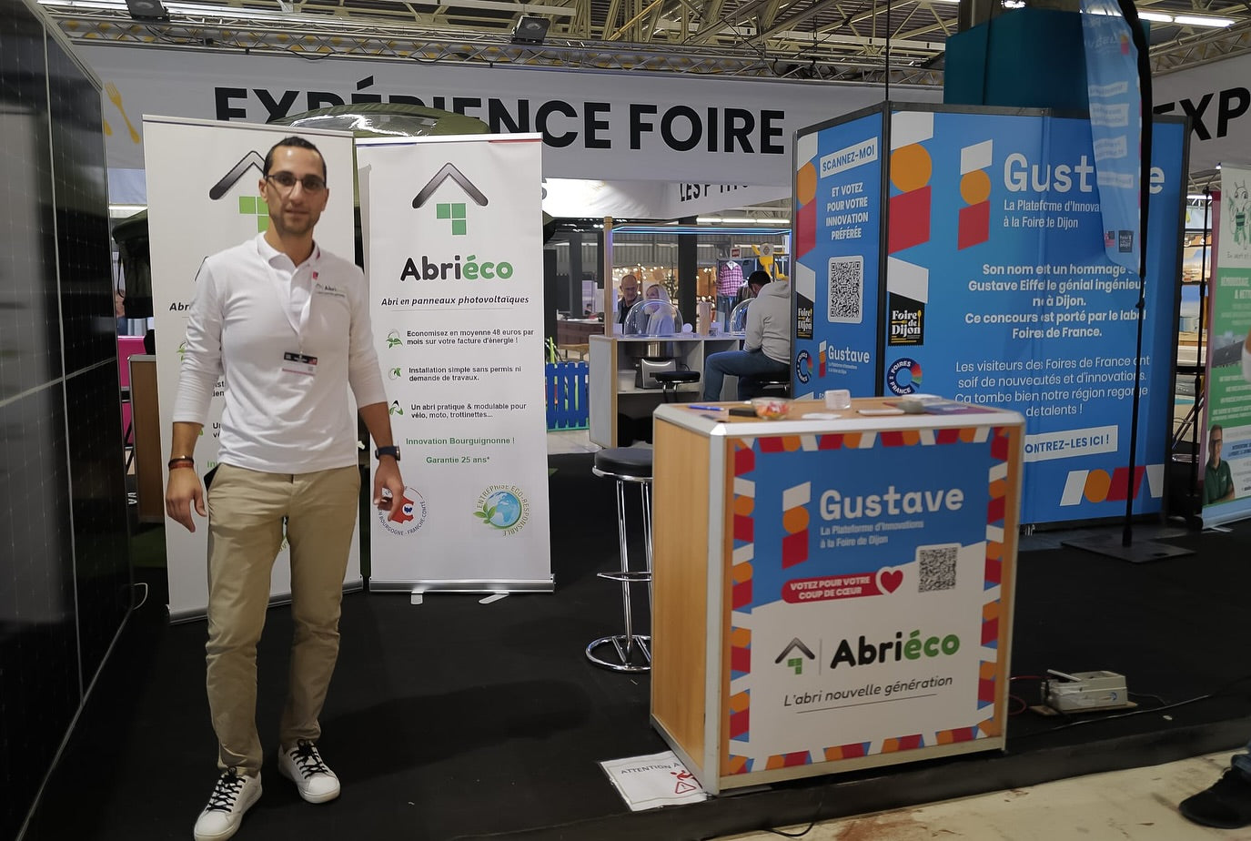Abrieco, lauréat du trophée Gustave 2025. Retenu parmi une centaine d'innovations. "Abrieco fait sensation en proposant le premier abri en panneaux photovoltaïque du marché à la fois simple et pratique pour rendre l'autoconsommation accessible à tous" (Marie-Paul membre du juré)